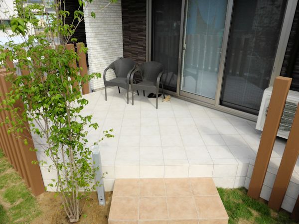 テラススペースもアプローチも高級素材のタイルをご採用いただき、