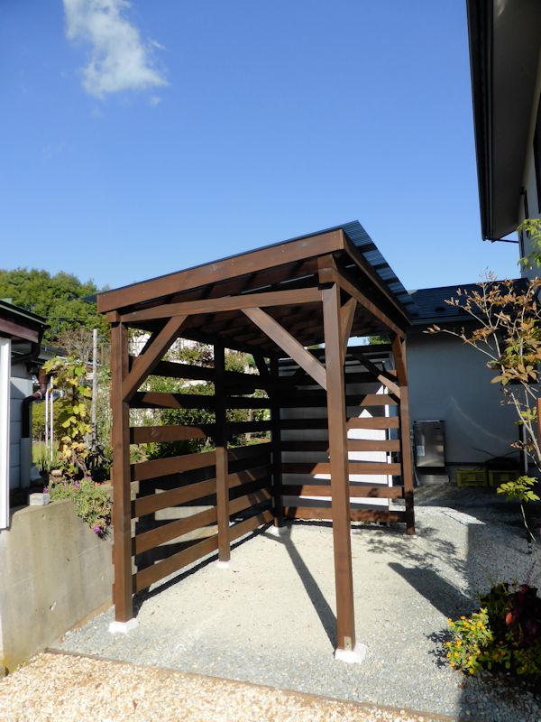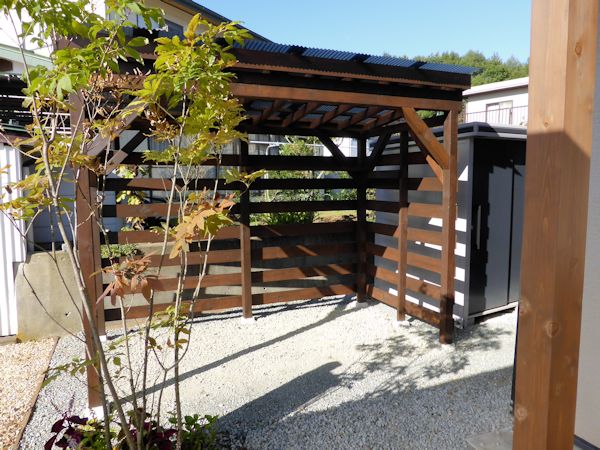 オリジナルの木製薪置場、自転車置場、そしてウッドデッキが