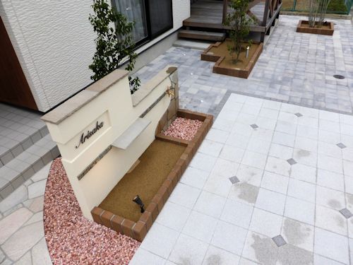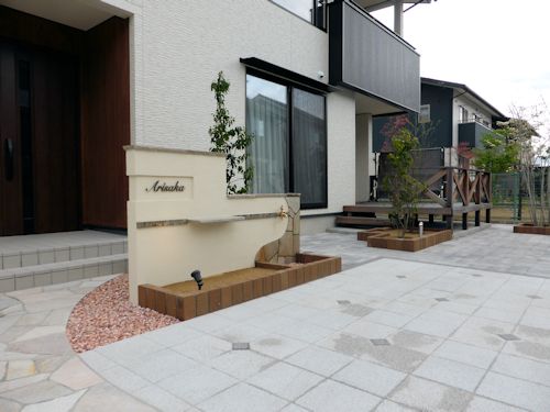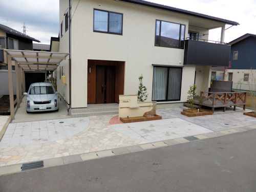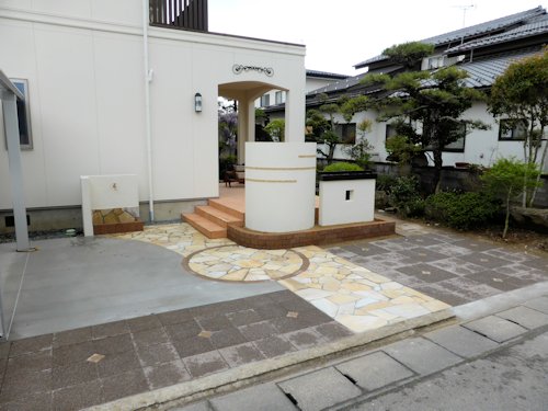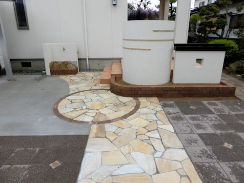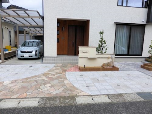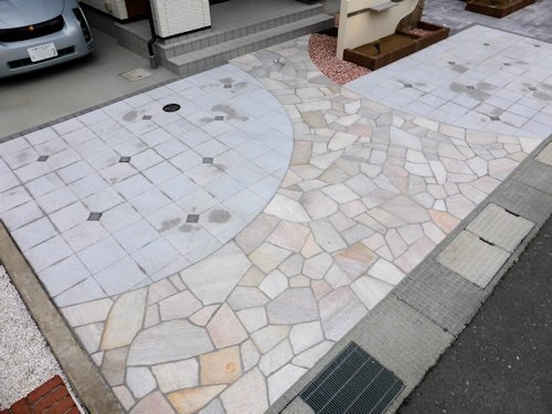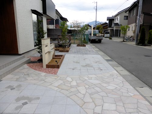 こちらのお宅は、天然石張りのアプローチとインターロッキングの