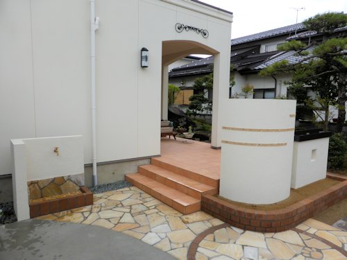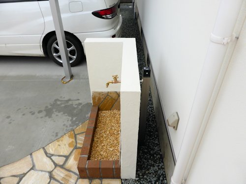 既設の味気ない立水栓も、塗り壁で隠してお洒落水栓になりました。