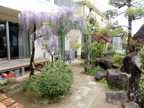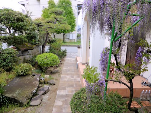 奥の自転車置場には、藤のトンネルをくぐっていきます。