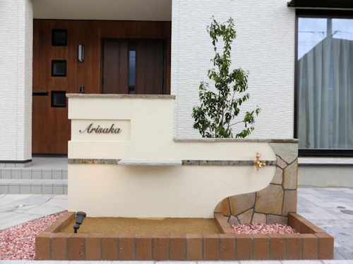 門柱は『アートウォール』の半円形をメインに、サブ門柱はブロック積みを