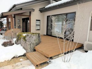 リビング・ダイニングを出ると広い天然木のウッドデッキ。