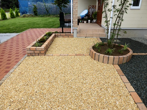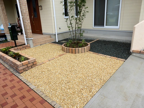 ただ化粧砂利を敷くだけでは変化がないので、中央にシンボルツリーの花壇をレンガで囲い、