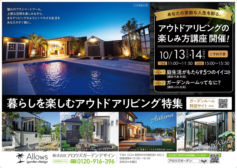今回はアウトドアリビング、ガーデンルーム特集としてイベントを10月13日,14日に開催します。