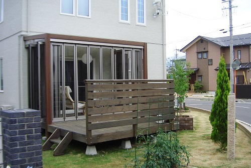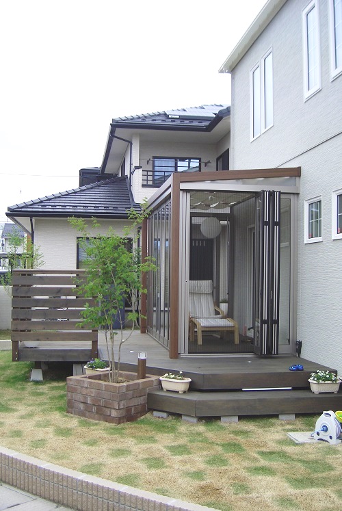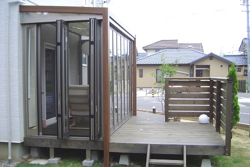 ガーデンルーム内のウッドデッキは、隙間のないフロアー材を張りました。
