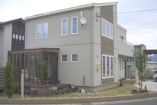 ウッドデッキはレッドシーダー製で、グレーの塗装で仕上げました。