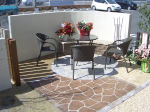 ガーデンテーブル&チェアがゆったり置けます。 たったこれだけのスペースで、6人くらいは座れます。