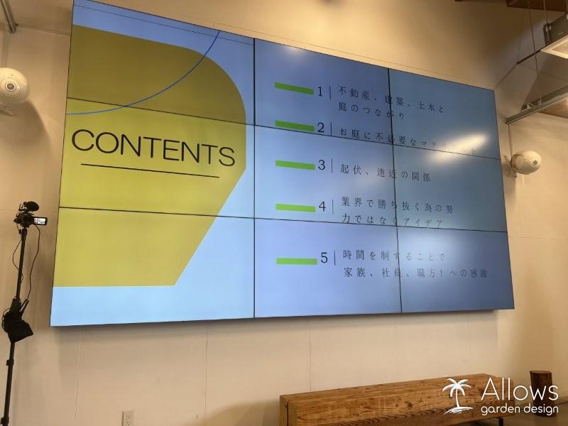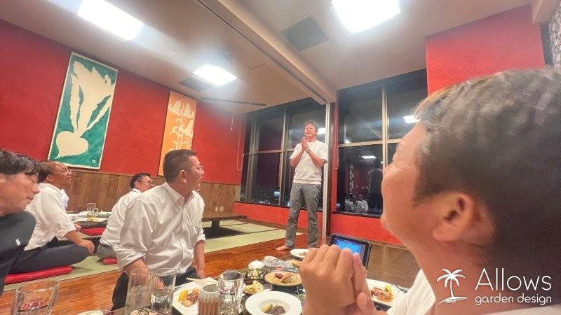 講演テーマは『お庭にエンターテイメントを!』という題名で5つの題材「不動産、建築、土木とお庭のつながり」・「お庭に不要なマテリアルを」・「起伏、遠近の関係」・「業界で勝ち抜くための努力ではなくアイディア」・「時間を制することで家族、社員、職方への感謝」とどれも気になる内容で、あっという間の時間でした。