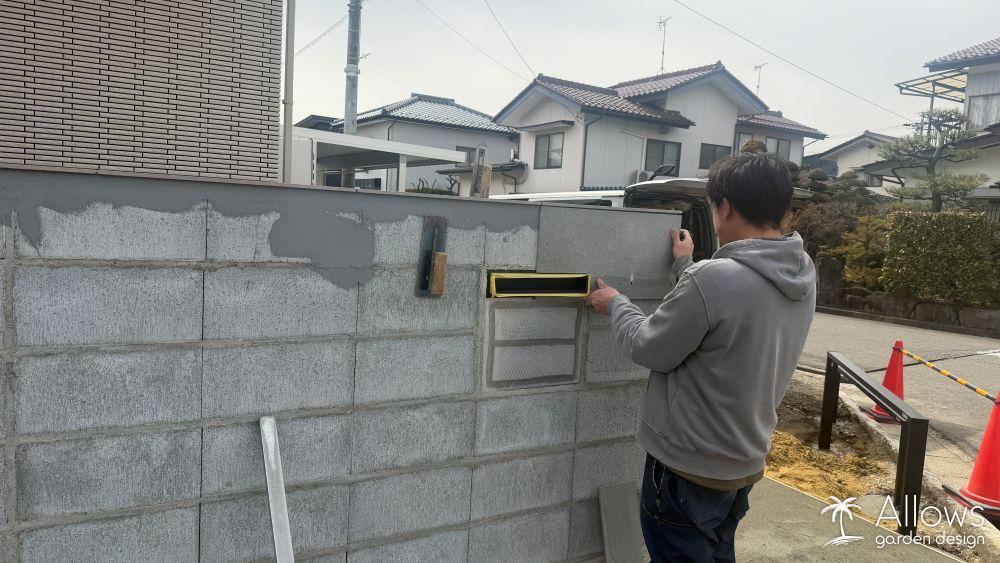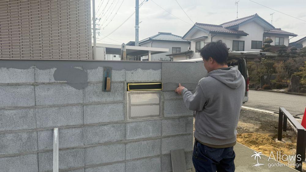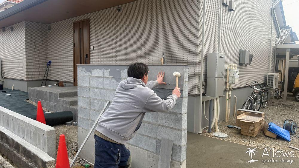 このブロック塀をタイル面とジョリパット面、それぞれ異なる2通りの施工風景をご紹介いたします。