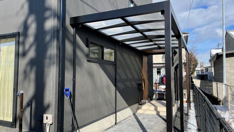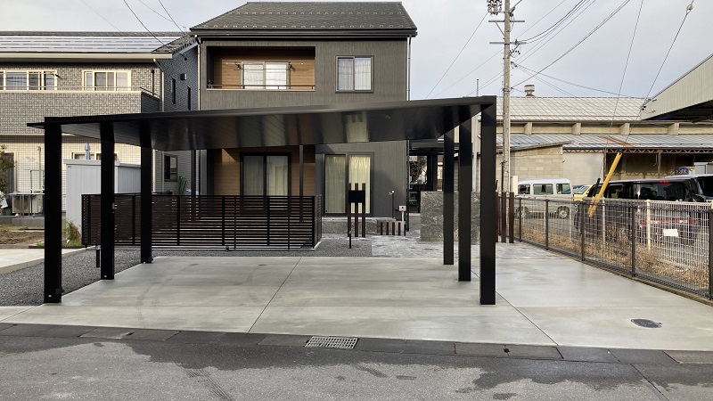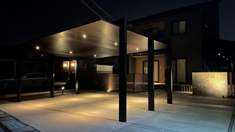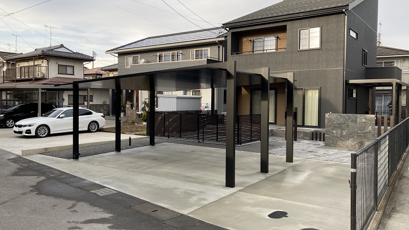 統一感を演出するためにGルーフを設置し、カーポートやテラス屋根と色合いを合わせています。