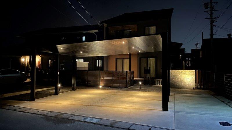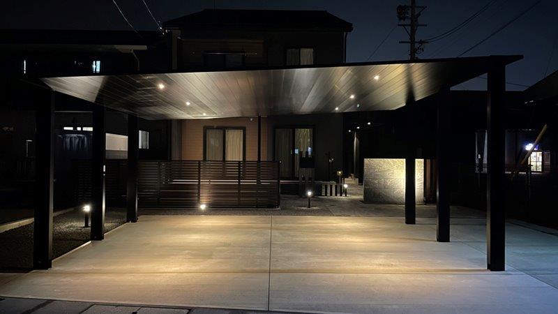 住宅に合わせ黒を基調に木調色をフェンスやライトに使用しアクセントにしています。
