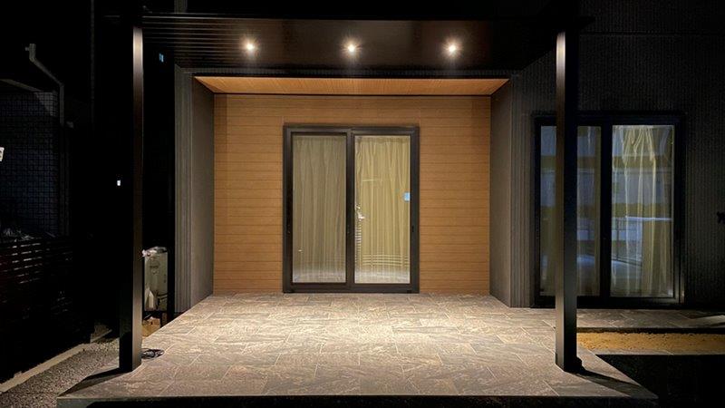 テラス空間は石調のタイルで仕上げ、高級感ある落ち着いた雰囲気に。