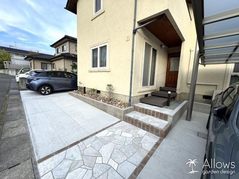 正面玄関のデザインと調和した石張りとレンガが、全体のアクセントとなっています。