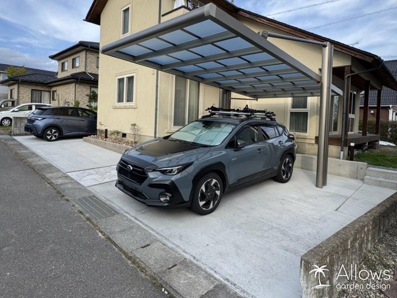 床面はコンクリート舗装でローメンテナンスに仕上げ、後方支持タイプのカーポートを設置。