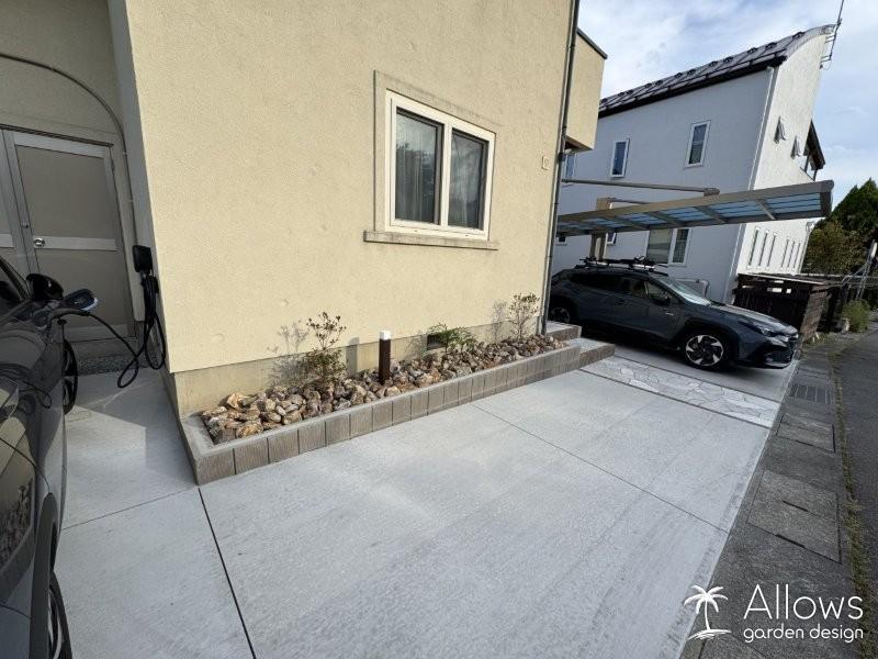 道路勾配に合わせてコンクリートを打つと、家の基礎が見えすぎてバランスが悪くなるため、花壇を設置しました。