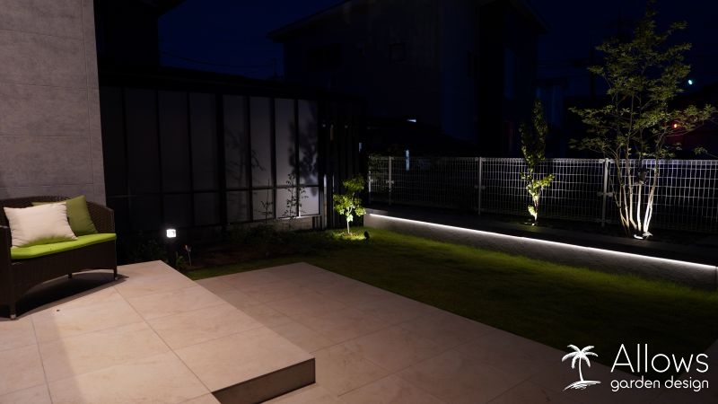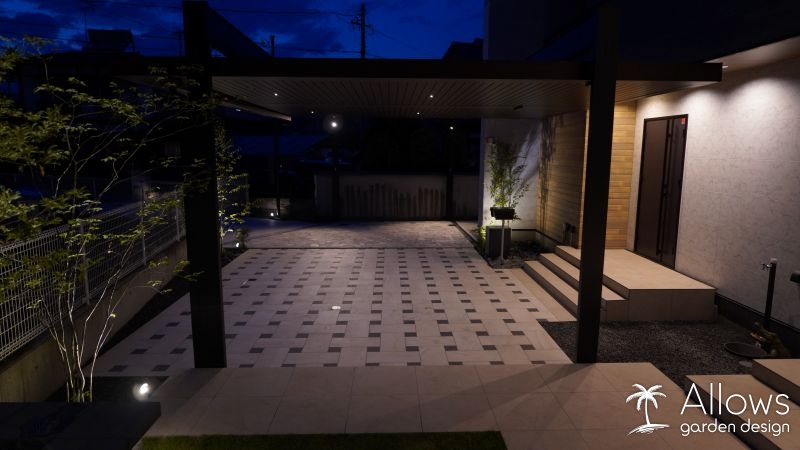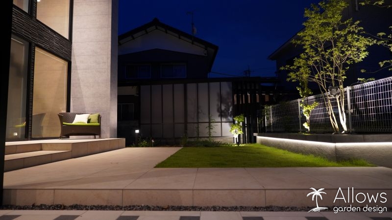 壁面の陰影、足元を導く光、そして樹木を照らす柔らかな輝き。 帰宅するたびに誇らしくなるような、上質な夜景を演出しました。