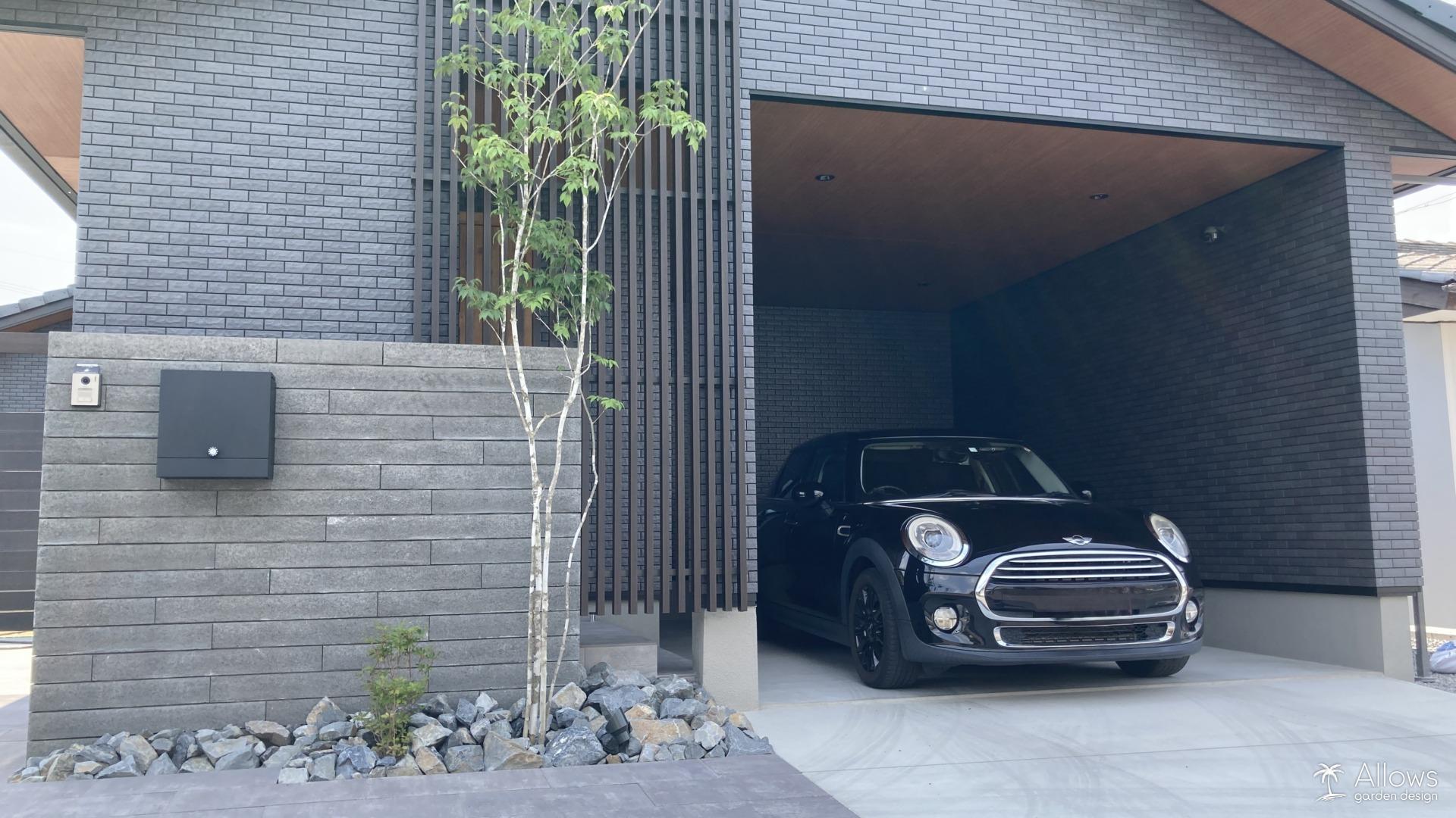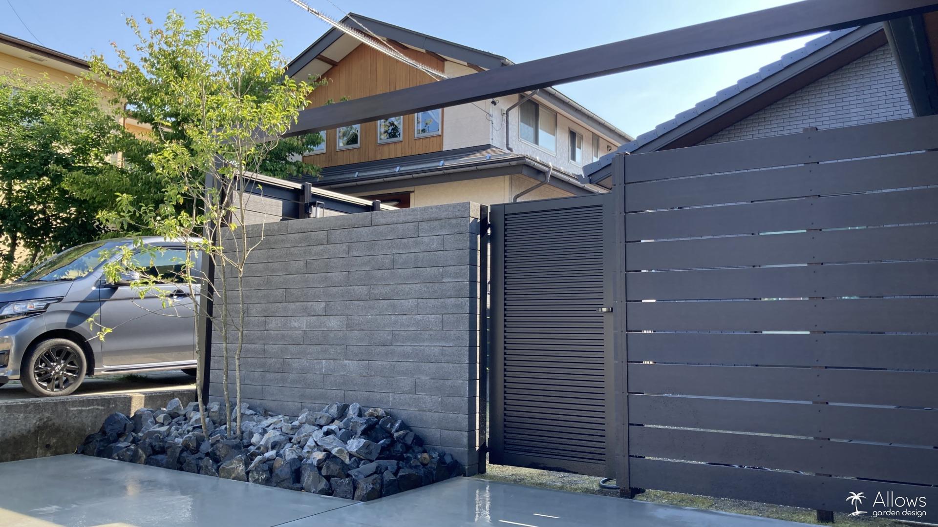 コンクリートブロック門袖×植栽×揖斐黒石×ライト