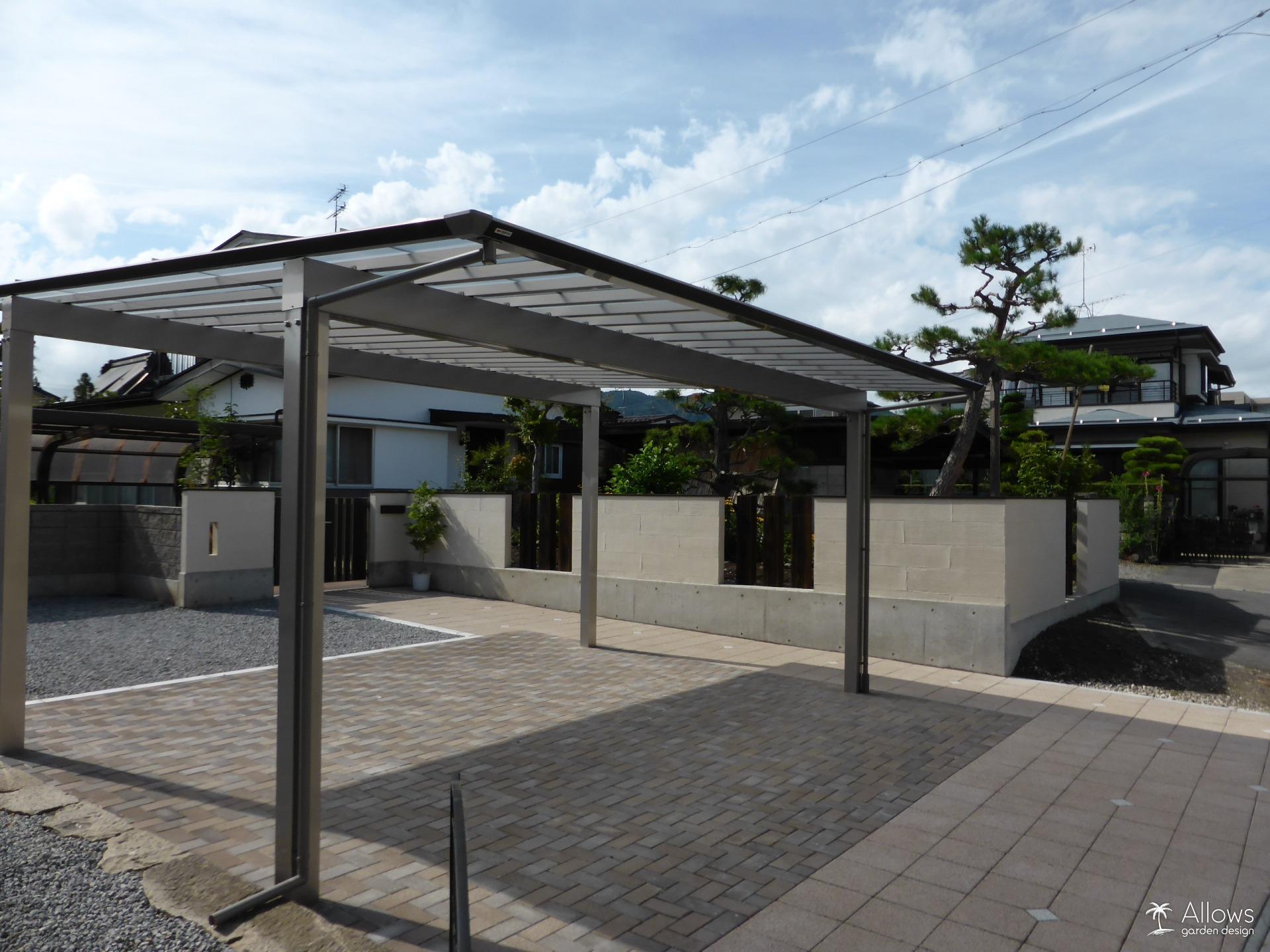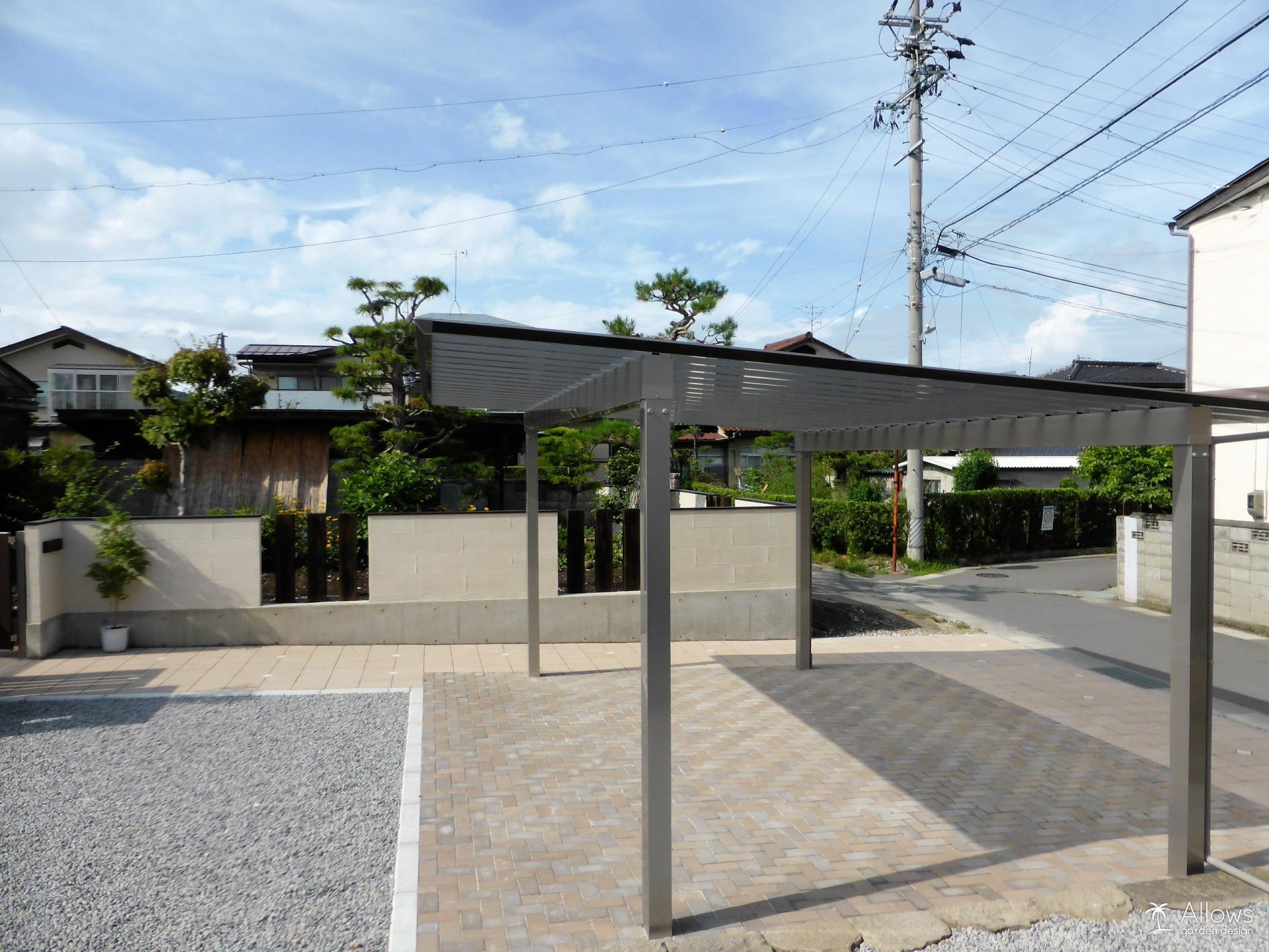 人工木ウッドデッキ、タイルステップ、アルミ屋根