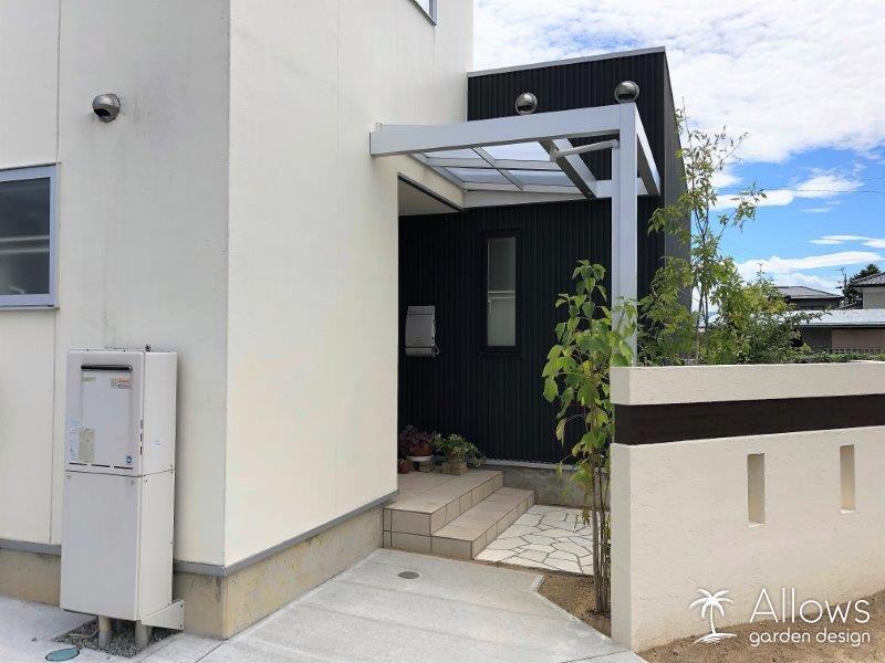 ホワイトの石張り×ブラックレンガ ツートンアプローチ