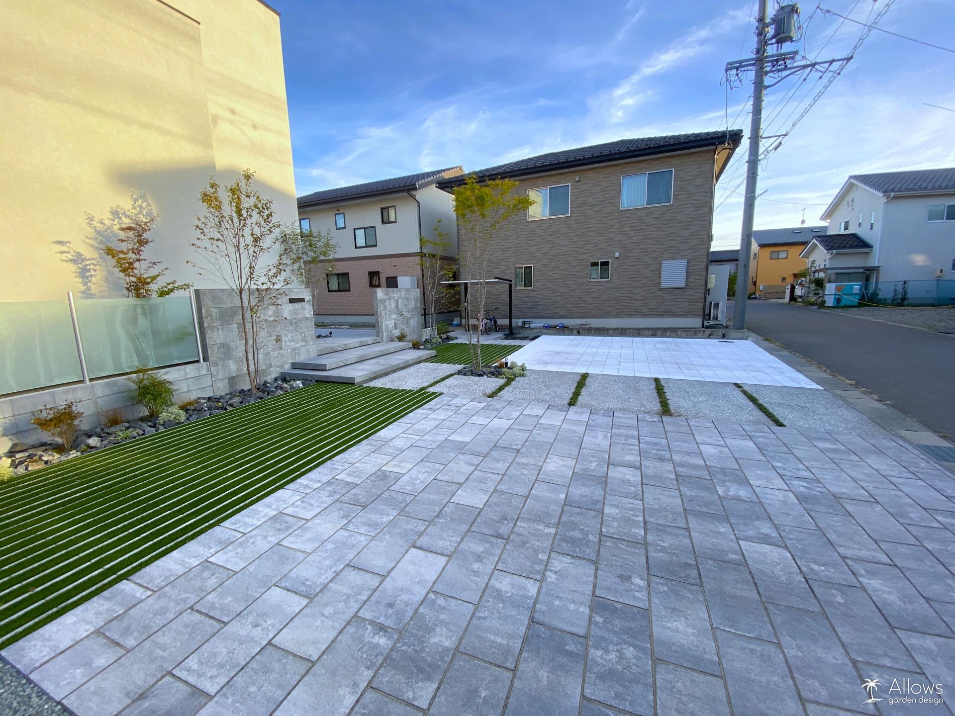人工芝と花壇と枕木の駐車スペース