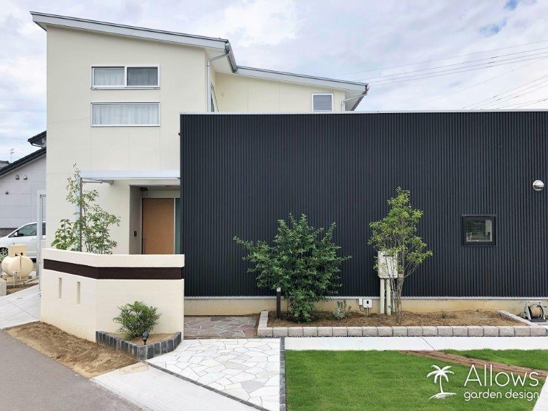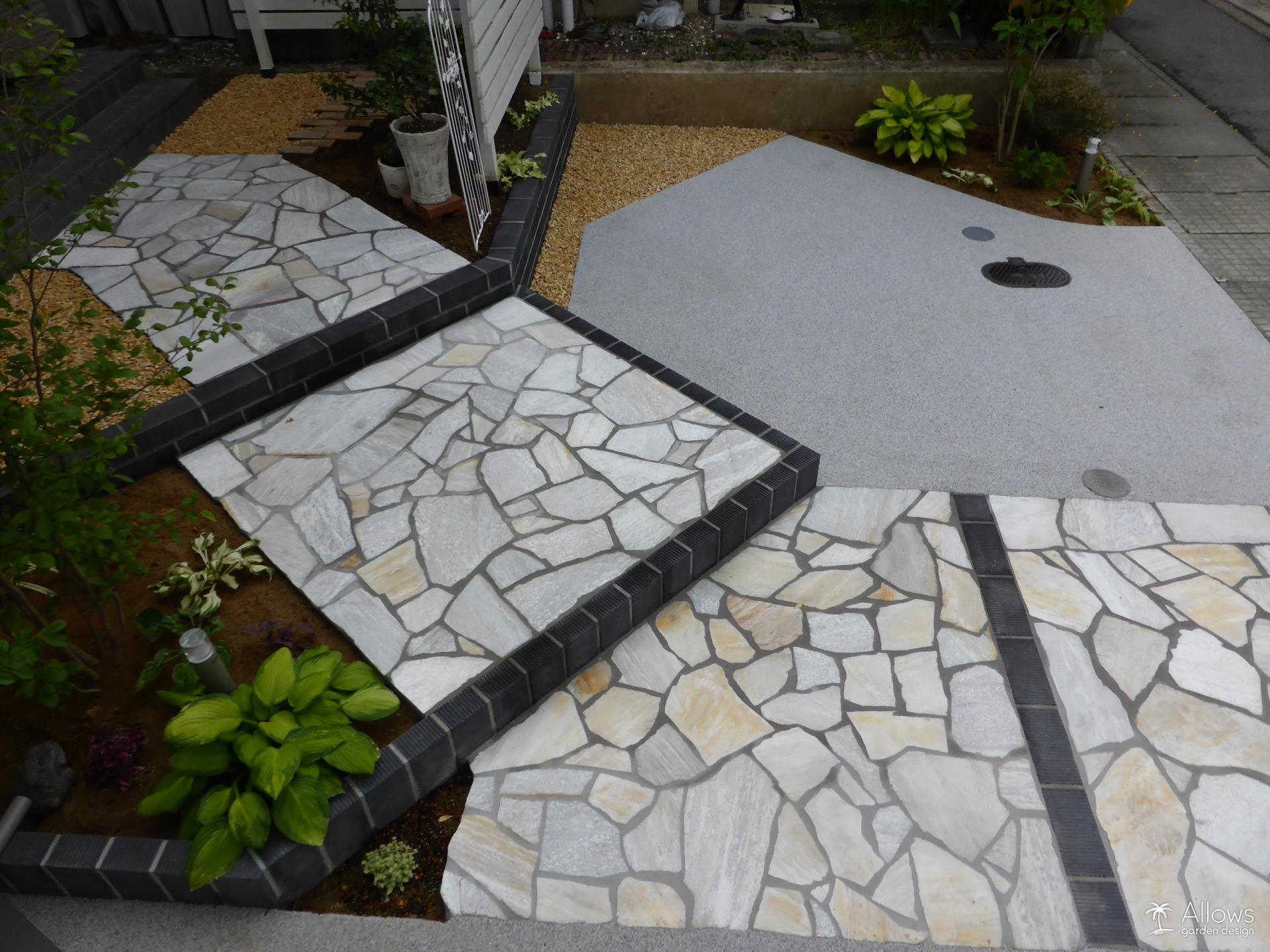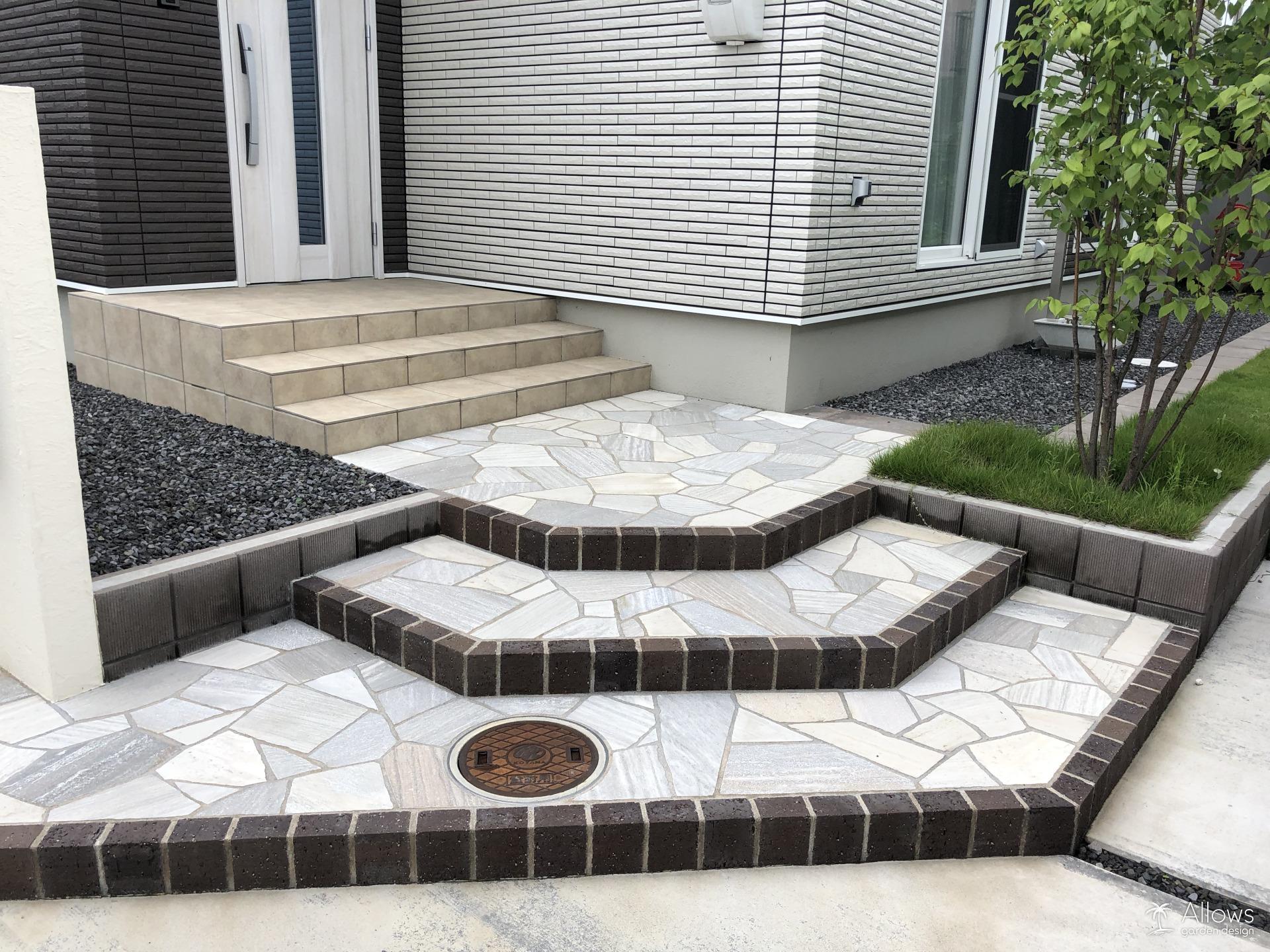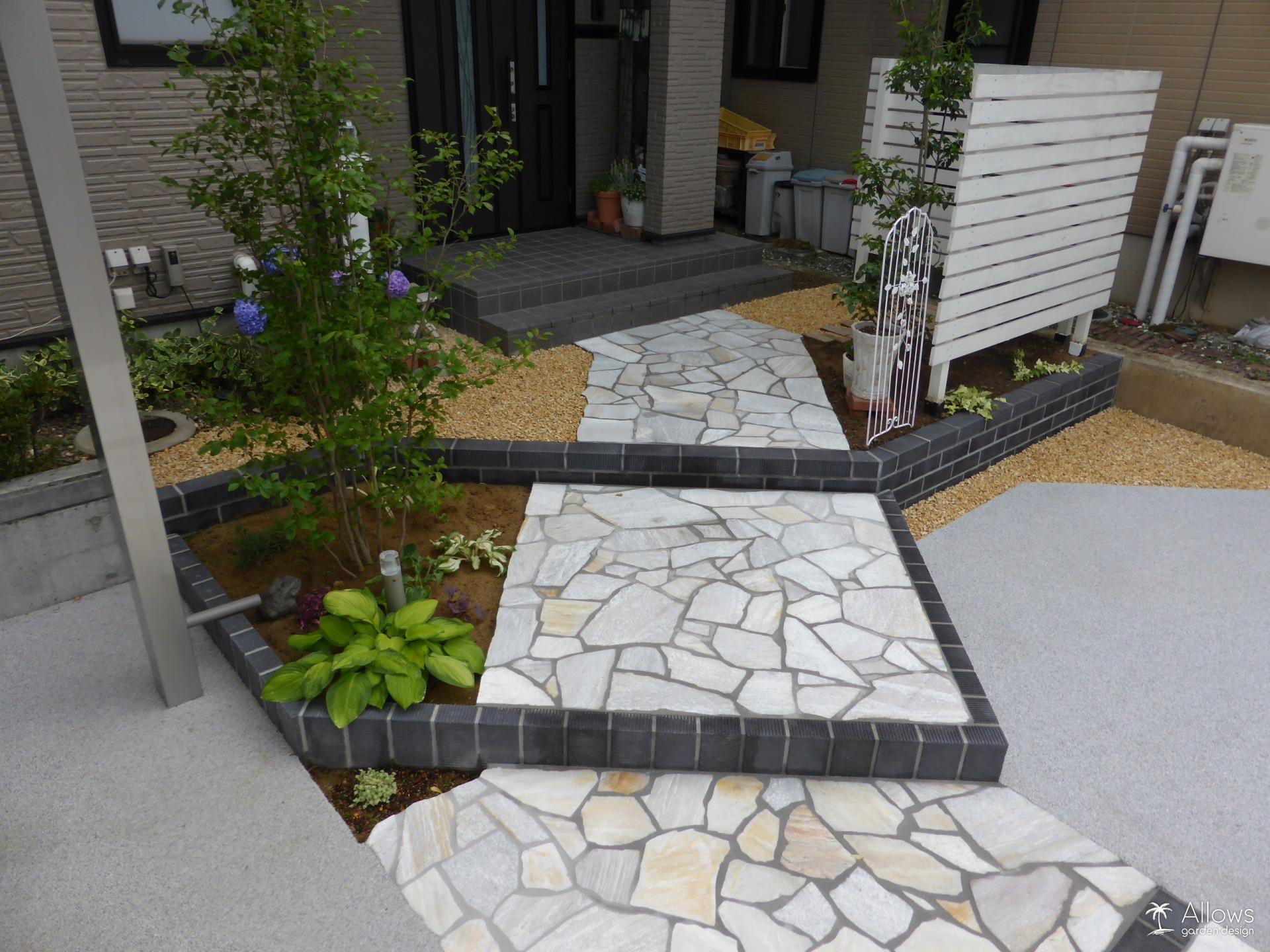 ホワイトの石張り×ブラックレンガ ツートンアプローチ