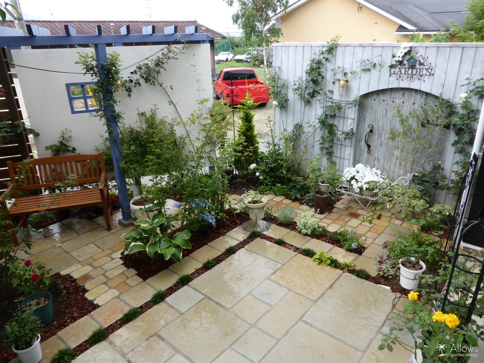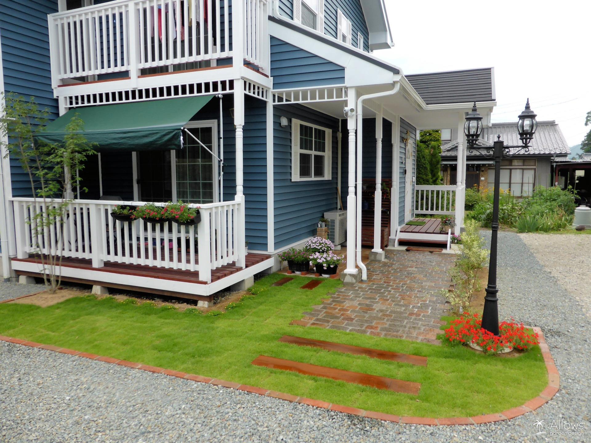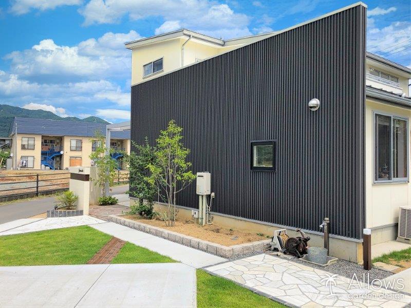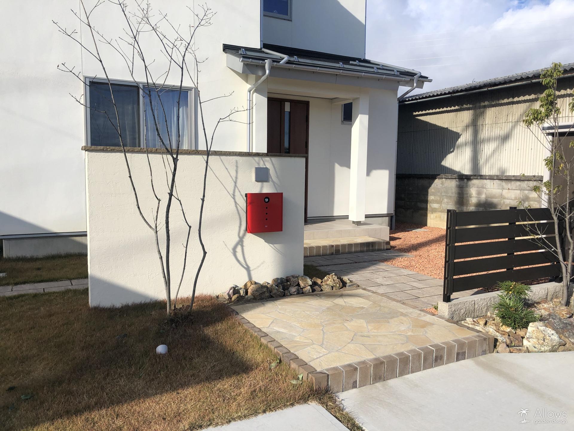 ホワイトの石張り×ブラックレンガ ツートンアプローチ