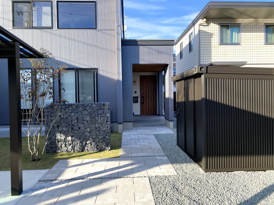 ガビオンの門柱にスタイリッシュなカーポート、物置ととても素敵になったと思います。