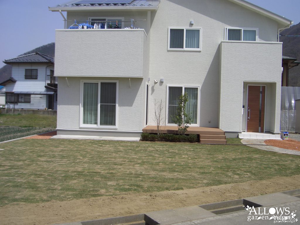 お子様が広々遊べるように、大々的に芝を張りました。高麗芝です。目地張りで張ったばかりなのでまだ表面の目土が目立ちますが、梅雨明けには真っ青な芝生が広がるでしょう。