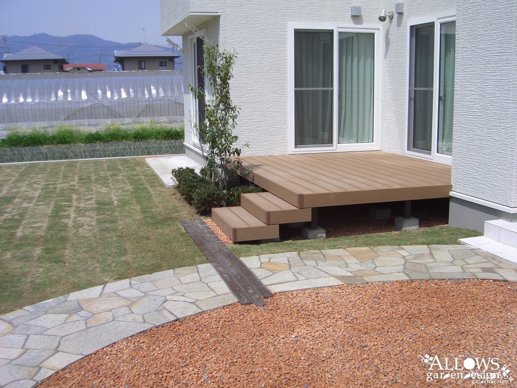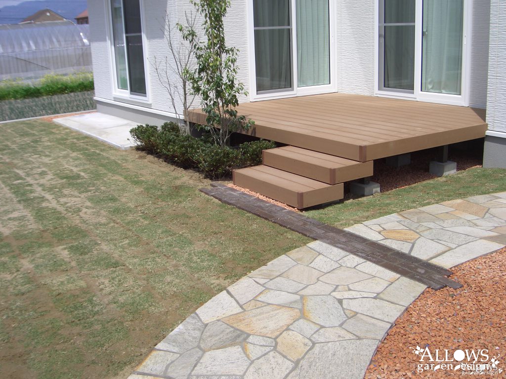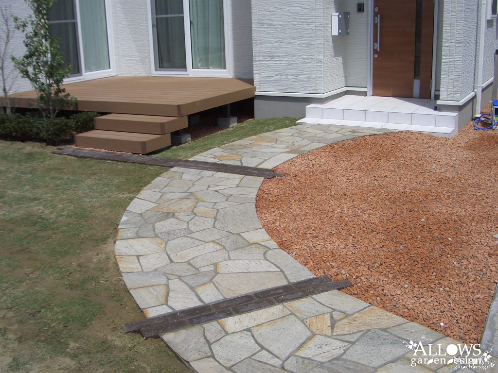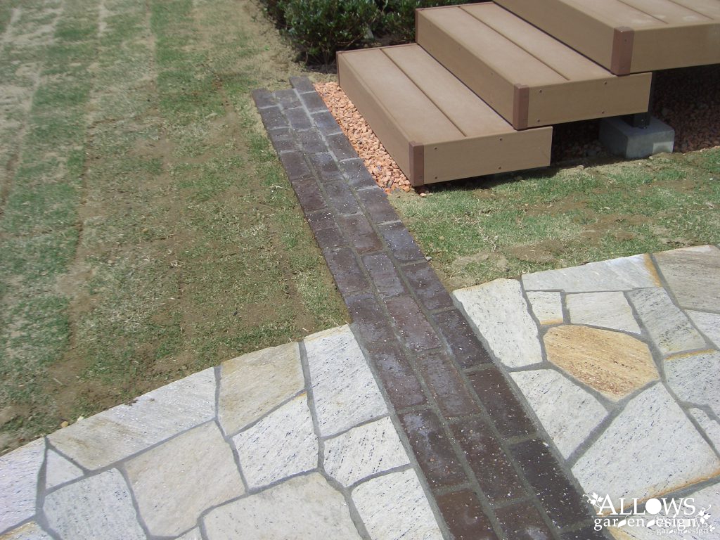 途中に2か所アクセントに入れたダークブラウンのレンガラインは、ハウスメーカーさんが設置したウッドデッキのステップへの園路も兼ねています。お洒落なデザインでさりげなく実用性も兼ねることが出来ました