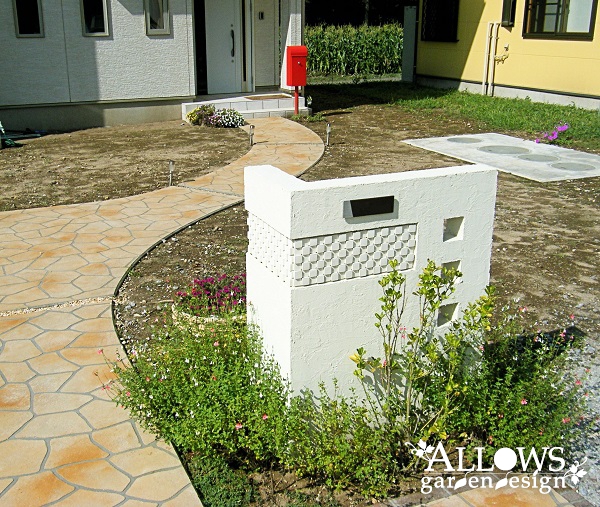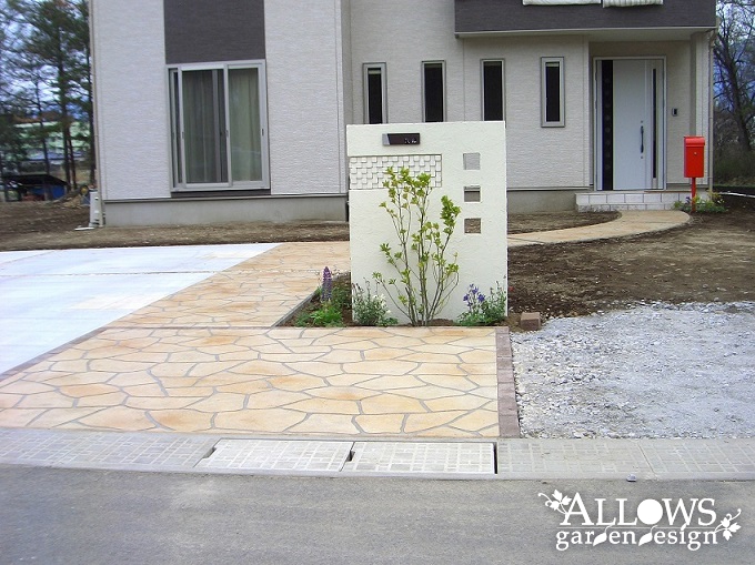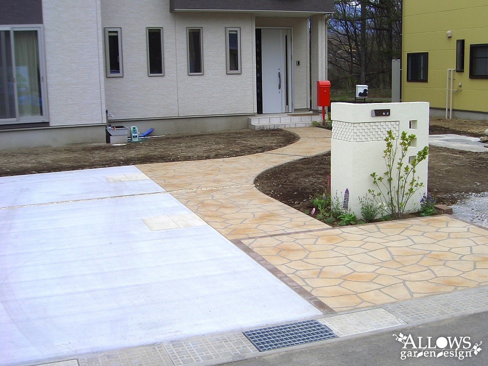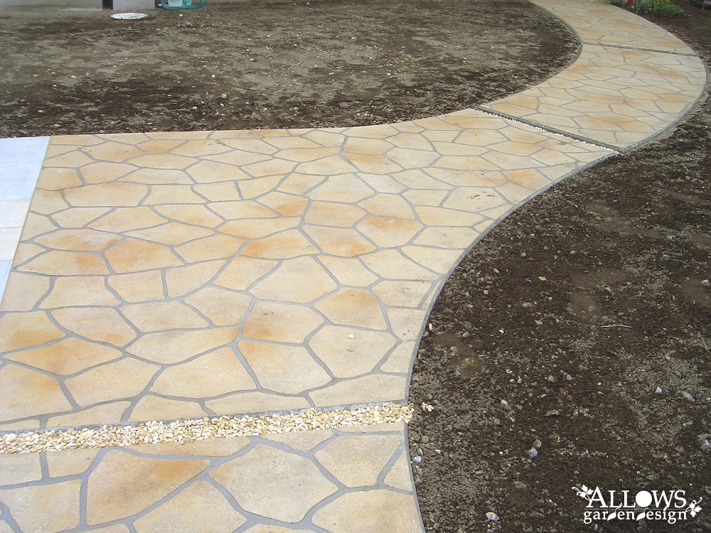 アプローチはステンシルコンクリート。注目してほしいのは、この綺麗な曲線形状。コンクリートの型枠に手間をかけると、ここまで綺麗に仕上がります。