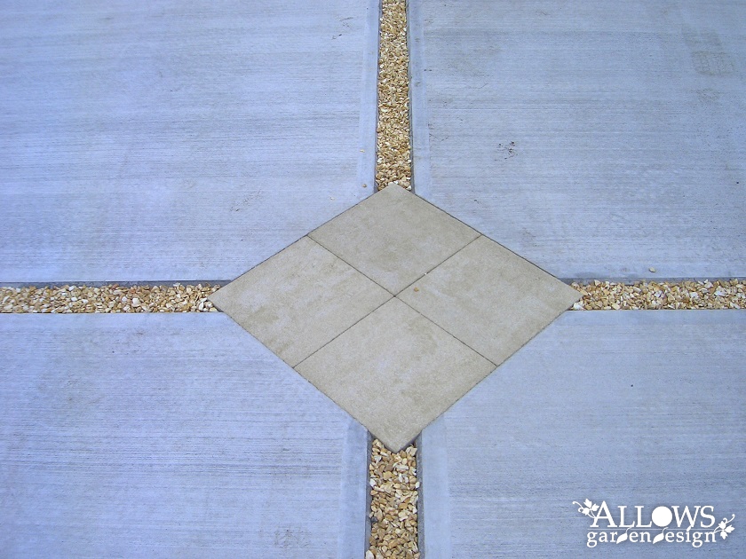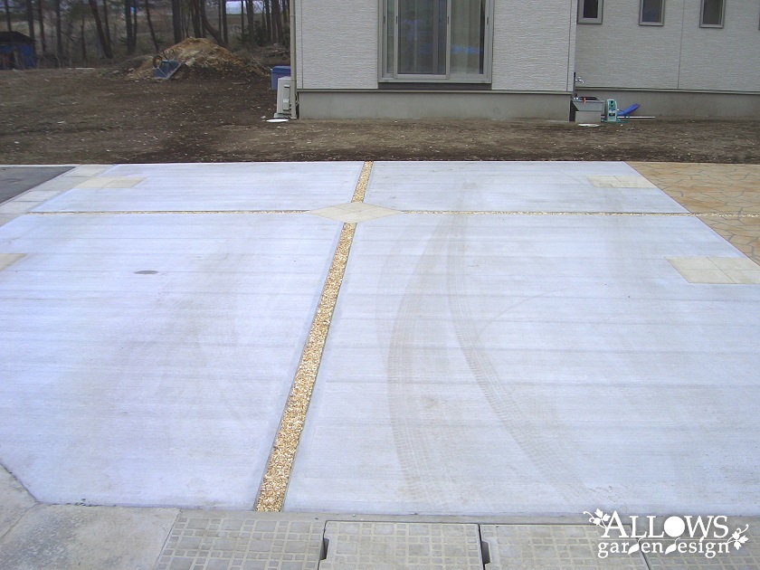 四隅だけだとちょっとわざとらしいので、中央にもアクセントをいれて、更にコンクリートのひび割れ防止に斜めに(正面から見るとひし形に)配置しました。デザイン性と実用性を兼ねた駐車スペースになりました。