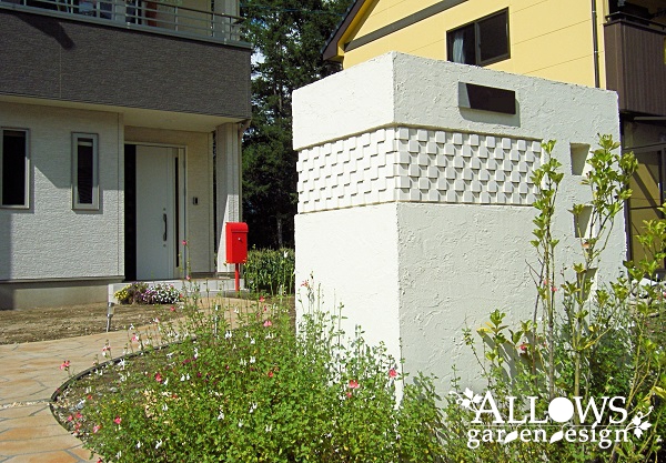 道路から玄関までがとても長いお宅ですが、視線を遮るものが何もないとどこか落ち着かないものです。そこで、シンボルとなる門柱をアイ・ストップとなるように設置しました。オリジナリティ溢れるこの門柱は、お洒落で存在感も抜群です。