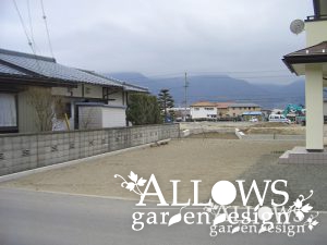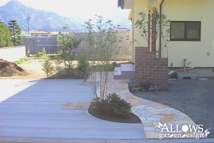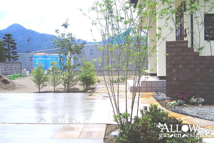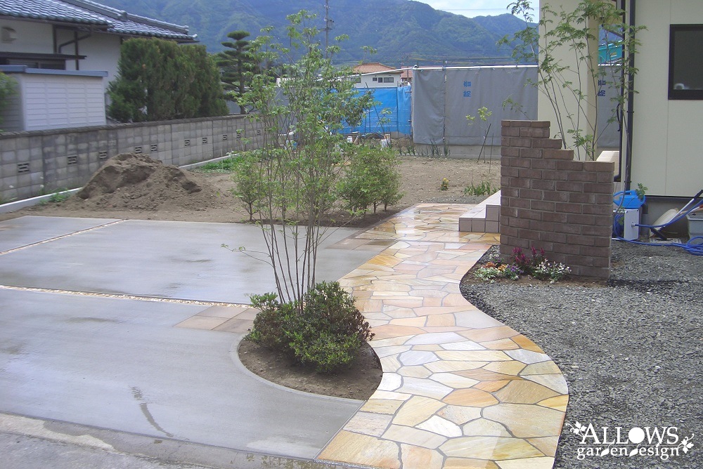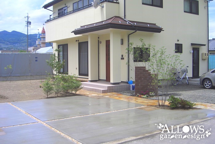 将来のカーポート設置を見越して、柱の予定位置部分にはインターロッキングでアクセント。