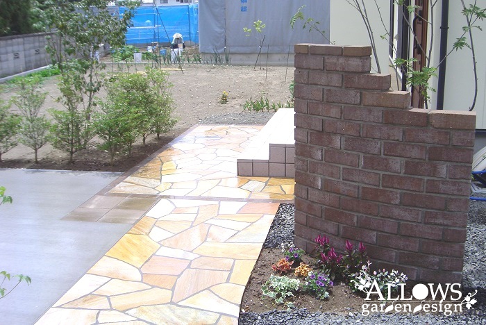 玄関まで視線がダイレクトで通らないように、植木とレンガ積みの門柱がアイストップ(eye stop)になっています。