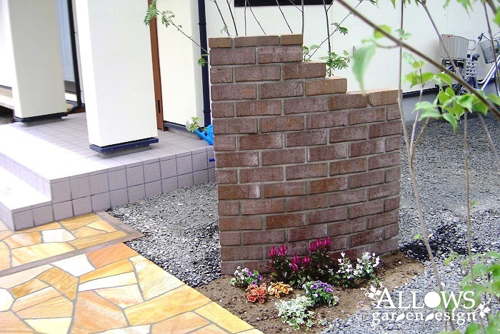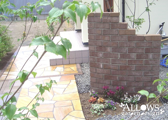 石張りの縁もレンガですが、思い切って濃い色を使うとしまって見えます。
