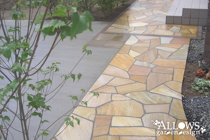 道路から玄関までの優しい曲線形状の石張りアプローチ。