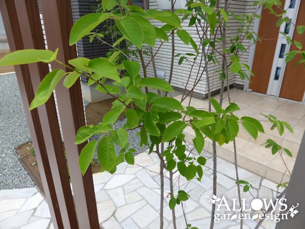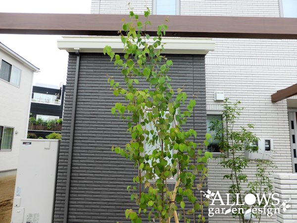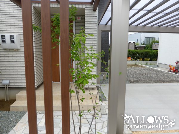 ただそれだけではなく、軽い仕切りに設置した格子や、目隠しに植えた植木上部のダウンライトを取り付けるためのフレームなど、デザイン的にも機能的にも兼用しています‼
