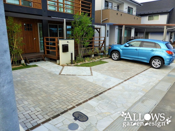 コンクリートだと無機質で照り返しも気になるため、ナチュラルテイストなヴィンテージ風のインターロッキングで仕上げ。