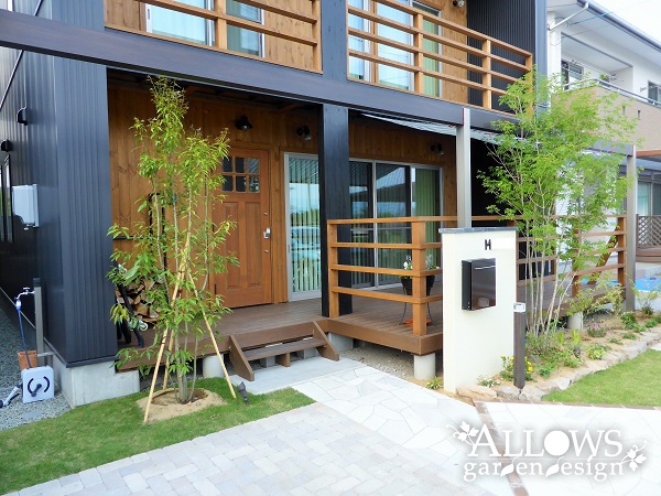 アプローチと同じ素材を使用することによって繋がりが生まれ、間口が広く見える効果と道路とのはっきりとした境界を示せます。