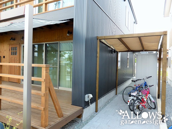 南面道路でウッドデッキスペースを広く取ってあり、デッキのすぐそばに車が止まるような配置です。