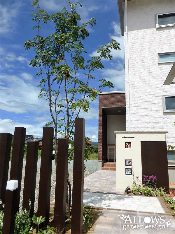 アプローチをクランクさせて、左側にスリットフェンスと高さ3mのナナカマド。