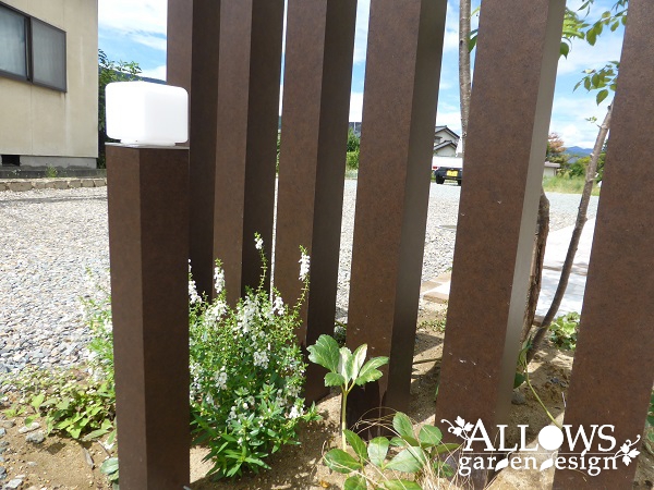 スリットフェンスとボードにはメタル調カラーのラスティコッパーを採用し、照明器具ともコーディネートしました。