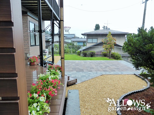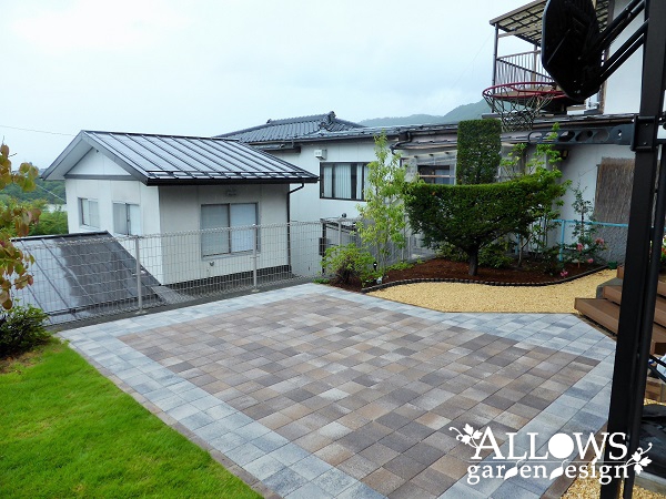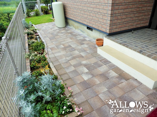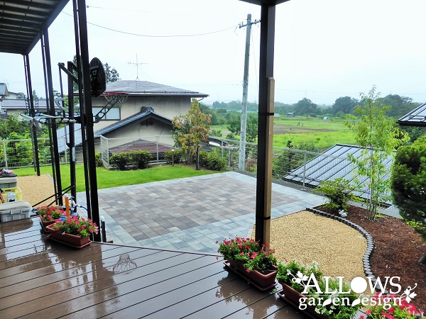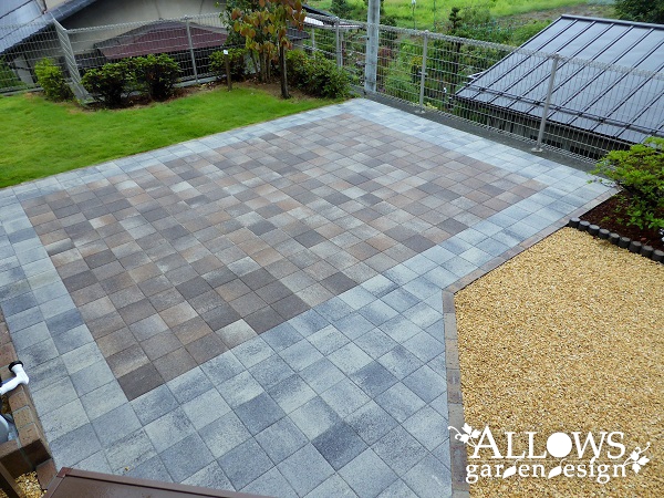 そのステップを降りると、インターロッキングのテラススペースが広がっています。