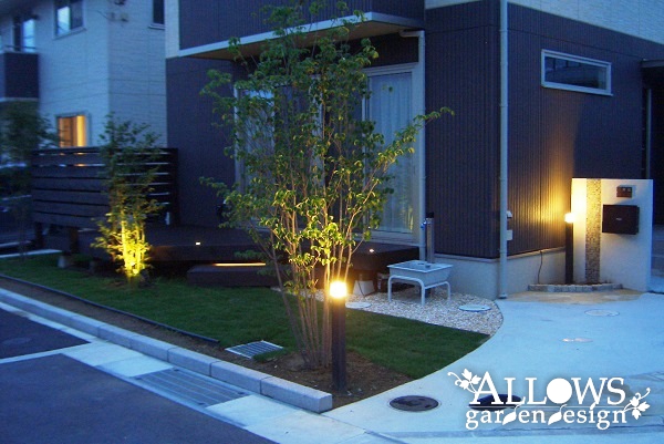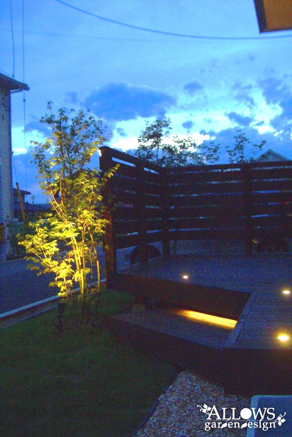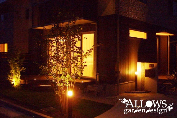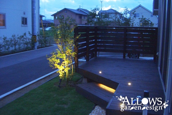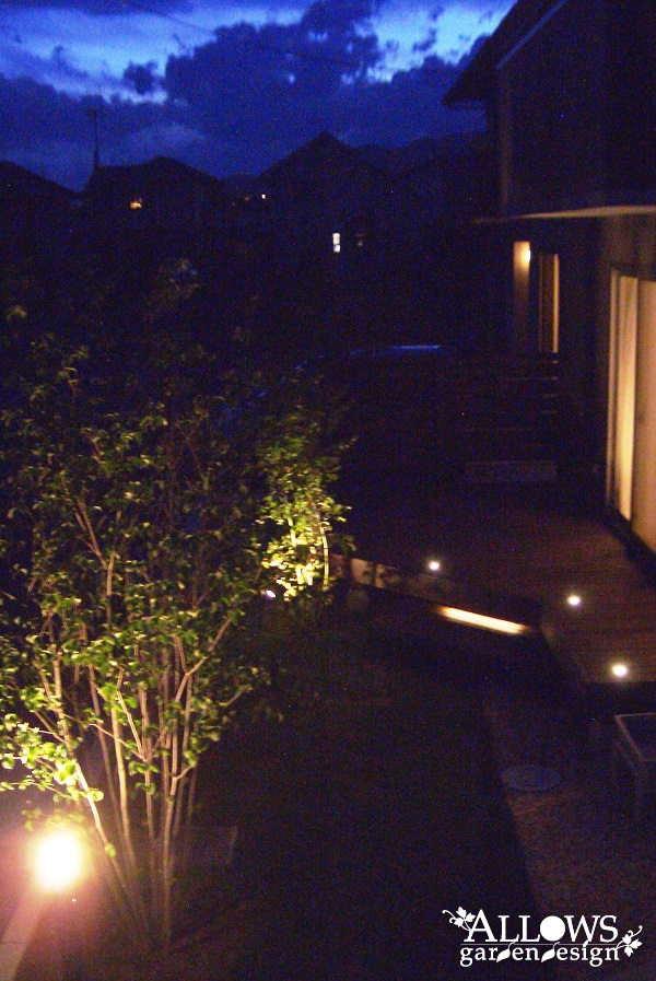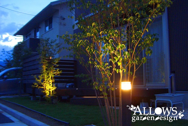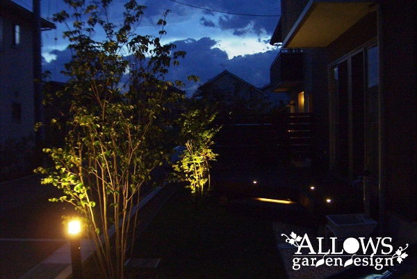 ステップ部分のLEDバー、植木を照らすアップライトです。