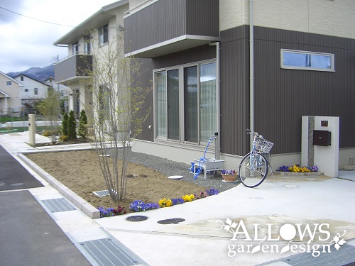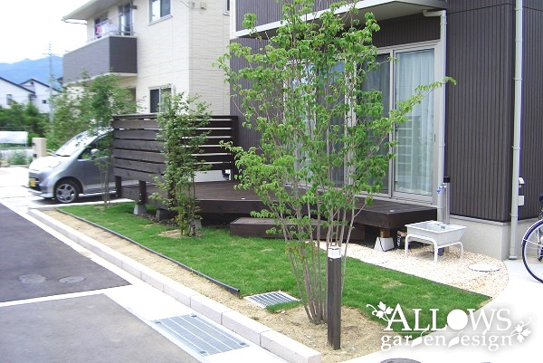 分譲地のつきあたりに位置するため、既存のヤマボウシと新しく植えたヤマモミジで