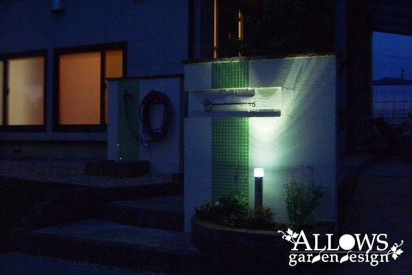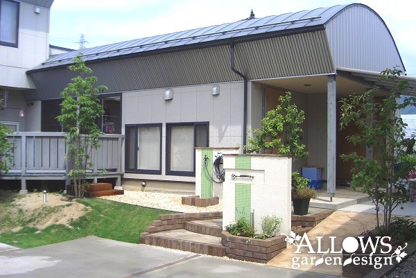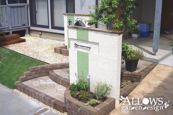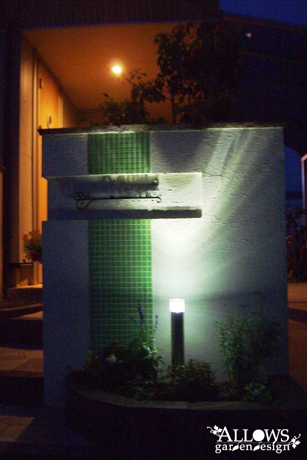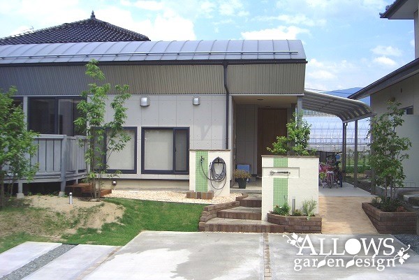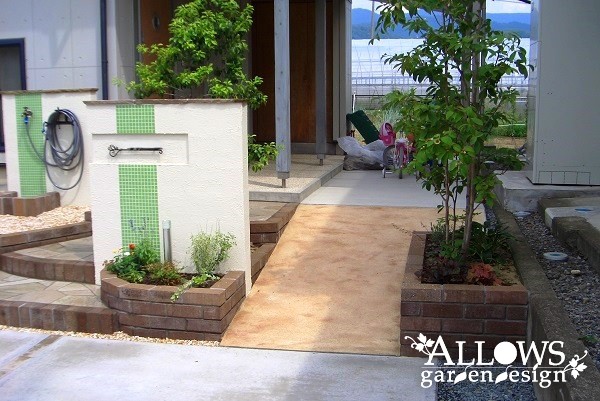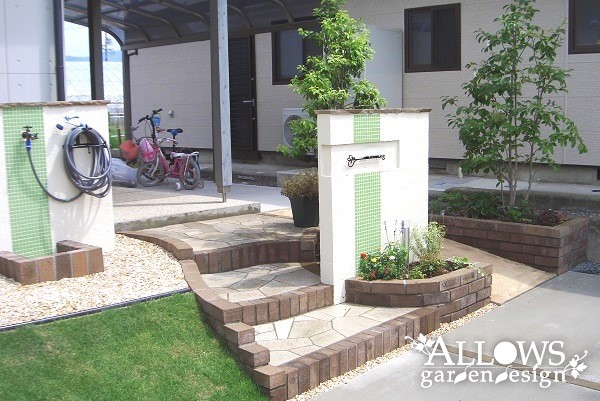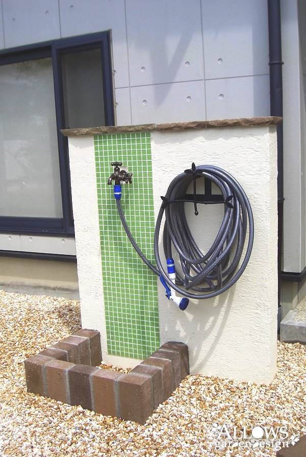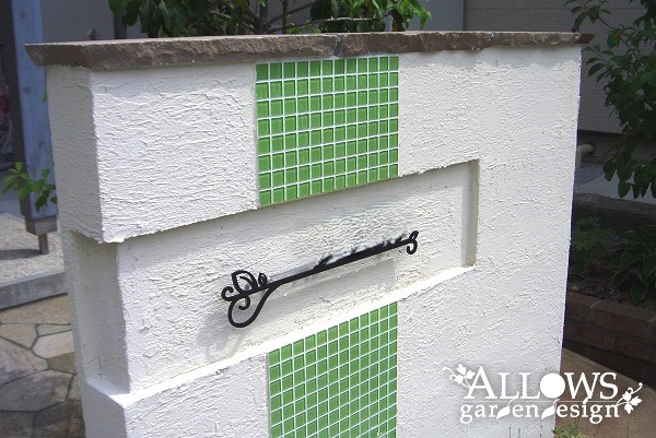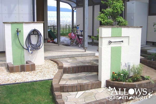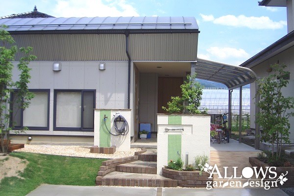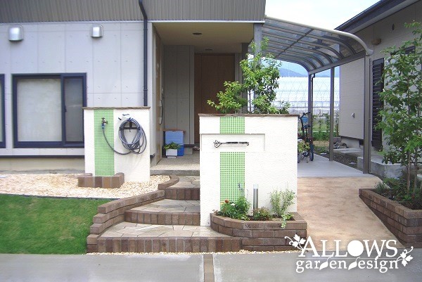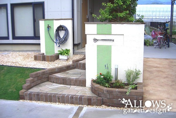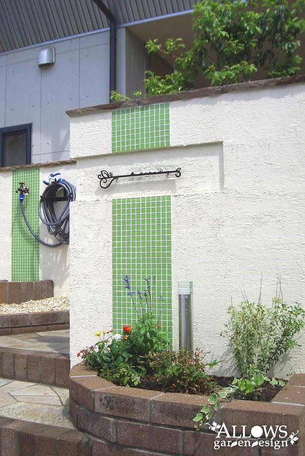 水跳ね部分は、門柱とデザインを合わせたライムグリーンのタイルで防汚対策。
