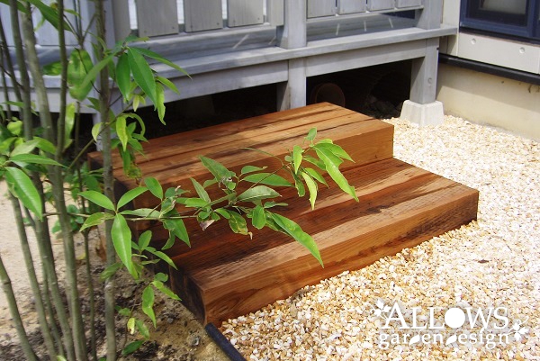 ウッドデッキのステップは、高耐久ACQ注入枕木。