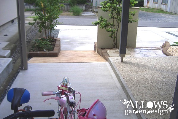 アプローチは、階段と自転車用のスロープを門柱で区切って作りました。