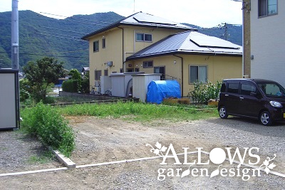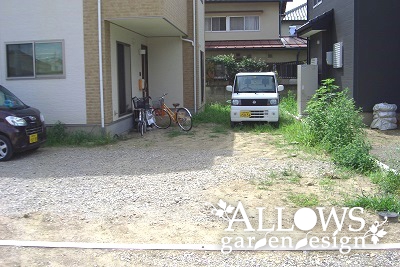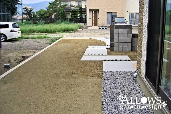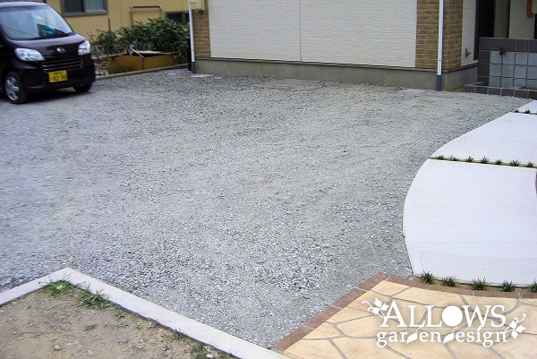 駐車場は全体的に防草シート(強力タイプ)の上に砕石を敷いて転圧、庭は防草シートの上に山砂を